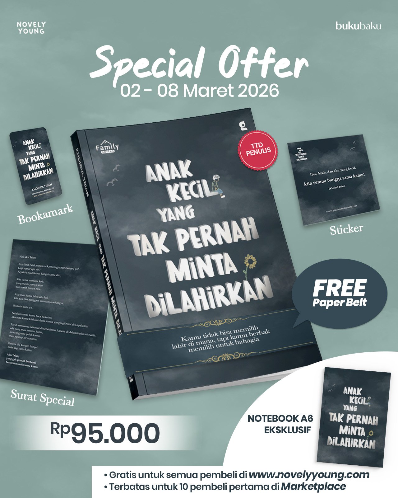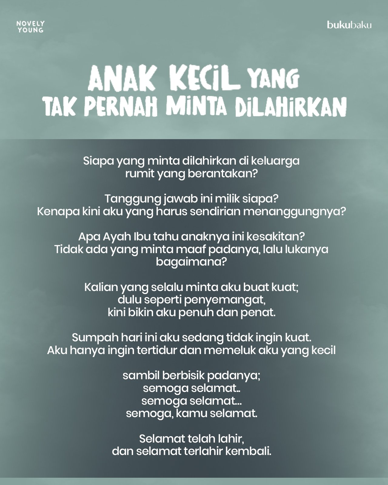 Anak Kecil yang Tak Pernah Minta Dilahirkan Penulis: Khoirul Trian Ukuran: 13 x 19 cm Tebal: 188 hlm Penerbit: GradienMediatama Harga: Rp95.000,- SINOPSIS Siapa yang minta dilahirkan di keluarga rumit yang berantakan? Tanggung jawab ini milik siapa? Kenapa kini aku yang harus sendirian menanggungnya? Apa Ayah Ibu tahu anaknya ini kesakitan? Tidak ada yang minta maaf…