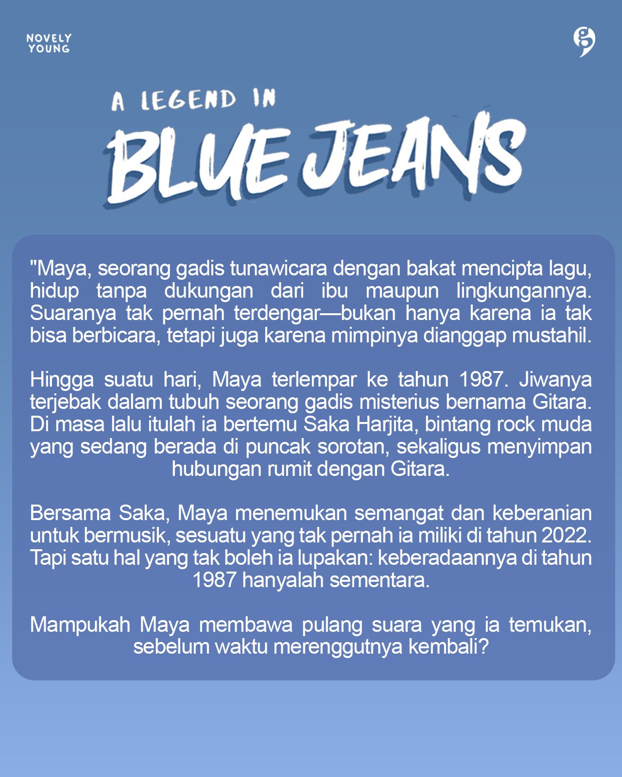 A LEGEND IN BLUE JEANS Penulis : A. Pradipta Penerbit : Gagas Media Harga : 125.000 Kategori Buku : Novel Ukuran : 14×20 Deskripsi “Maya, seorang gadis tunawicara dengan bakat mencipta lagu, hidup tanpa dukungan dari ibu maupun lingkungannya. Suaranya tak pernah terdengar—bukan hanya karena ia tak bisa berbicara, tetapi juga karena mimpinya dianggap mustahil.…