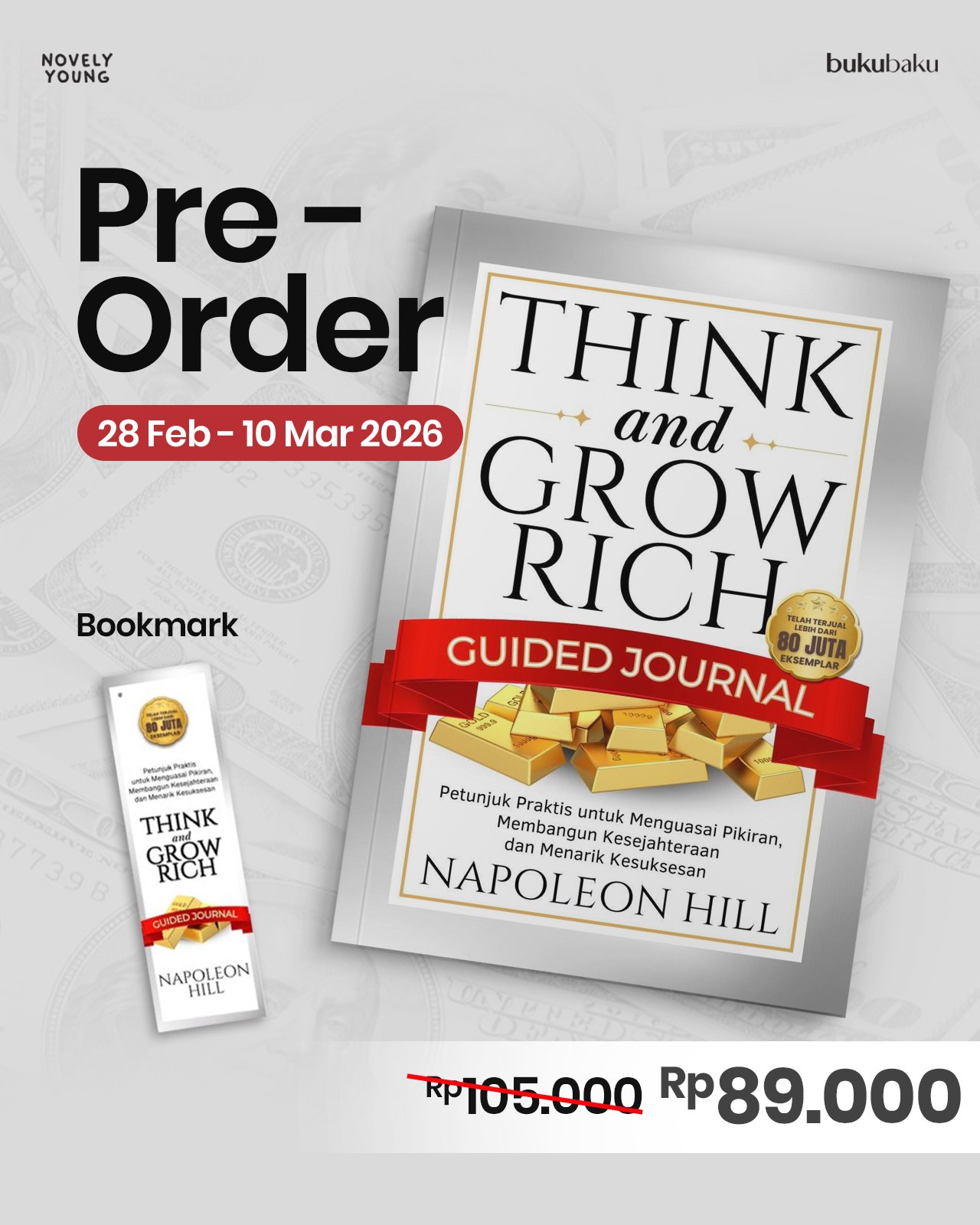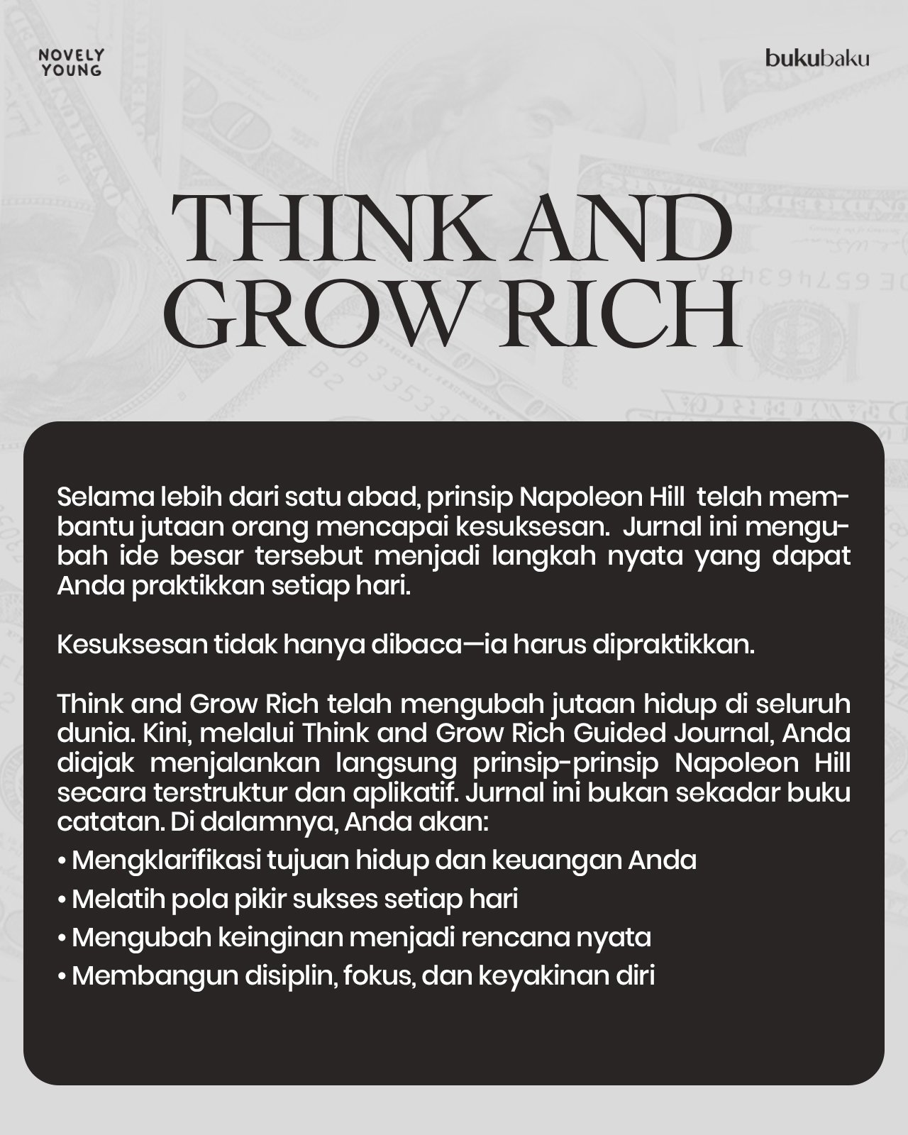 Think And Grow Rich Guided Journal Napoleon Hill Ukuran: 15 x 23 cm 234 halaman Harga: Rp105.000 Penerbit Arunabooks Publishing   Blurb: Selama lebih dari satu abad, prinsip Napoleon Hill  telah membantu jutaan orang mencapai kesuksesan.  Jurnal ini mengubah ide besar tersebut menjadi langkah nyata yang dapat Anda praktikkan setiap hari.   Kesuksesan tidak hanya…